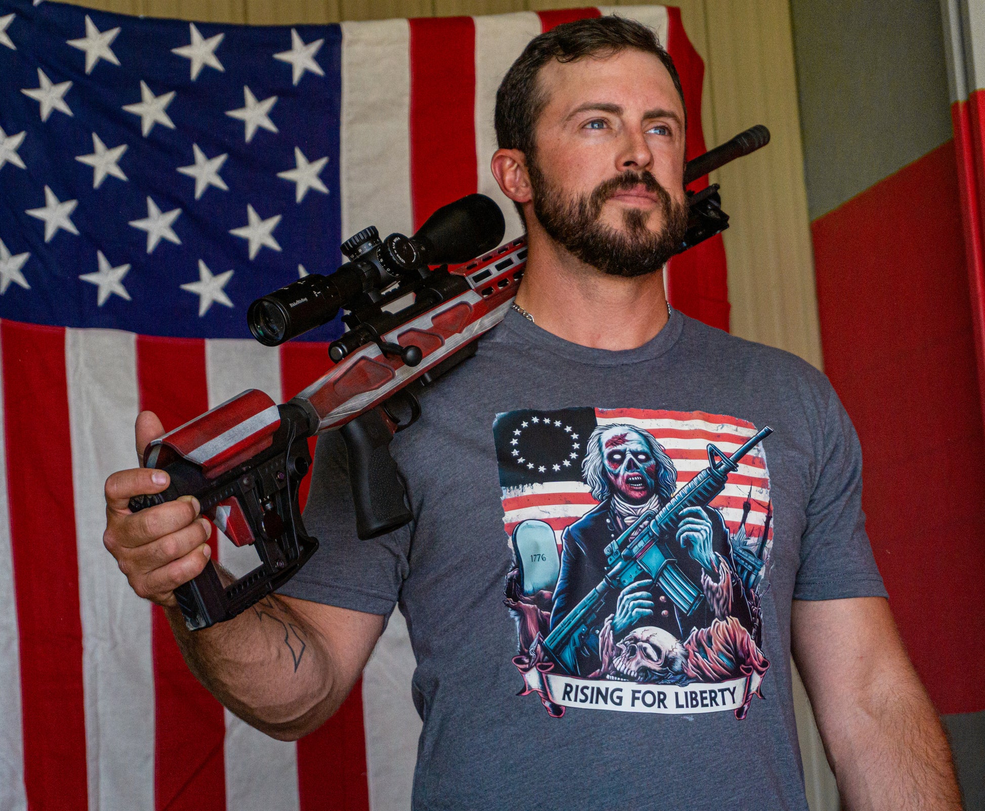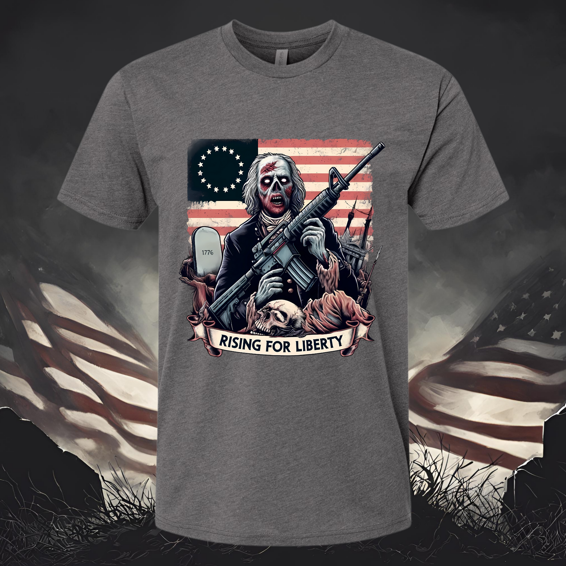Celebrate your American spirit with the Rising For Liberty T-Shirt by ROK IT, now available in a heavy metal gray. This tee is perfect for anyone proud to stand for liberty while rocking a bold, edgy look. Featuring a striking design with a revolutionary figure armed and ready, set against a backdrop of the iconic Stars and Stripes, this shirt captures the essence of American resilience and freedom.